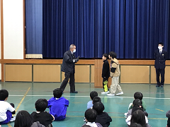 その後、児童会代表の児童が参加し、登下校時不審な人に話しかけられた際の対応の仕方についても教えていただきました。