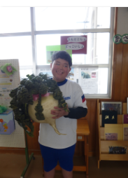 2月23日に大きなお寺で行事があり、その際地域の方がお供えした「桜島大根」を、子どもたちに見せてあげてくださいと、大きな大きな大根を2つプレゼントしてくださいました。